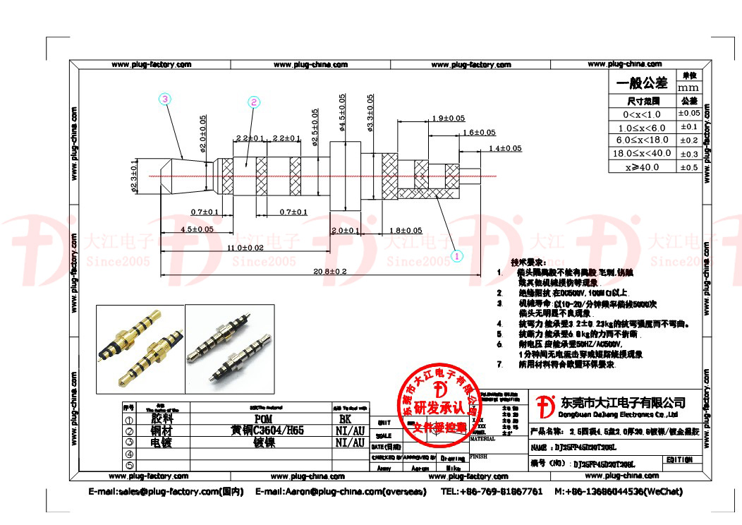 產(chǎn)品說(shuō)明:2.5mm四級(jí)4.5盤(pán)-2.0厚20.8L 鍍金 耳機(jī)插頭