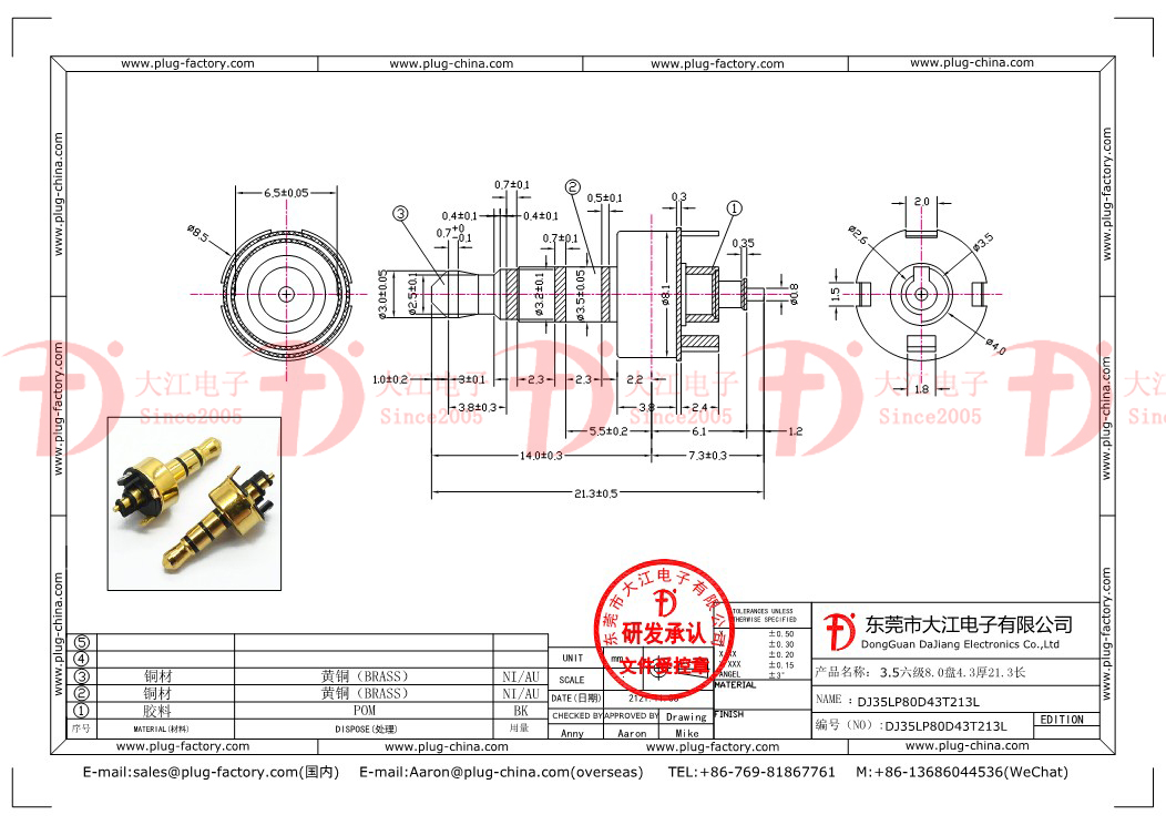產品說明:耳機插頭-3.5mm六級8.0盤4.3厚21.3L 鍍金