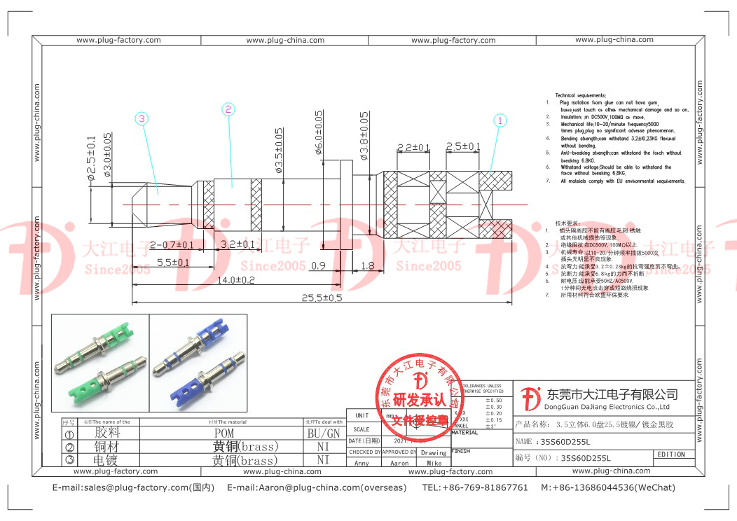 產品說明:耳機插頭 3.5mm立體6.0盤25.5L 鍍鎳藍膠