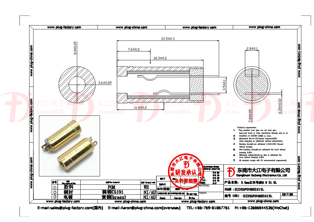 產(chǎn)品說明:3.5mm立體 總長:21.5L耳機母座 鍍金8.0