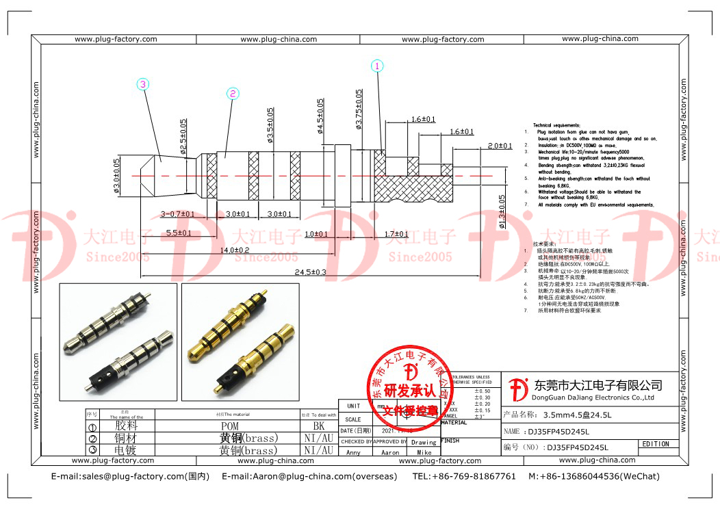 產(chǎn)品說明:耳機(jī)插頭-3.5mm四級4.5盤24.5L 鍍金