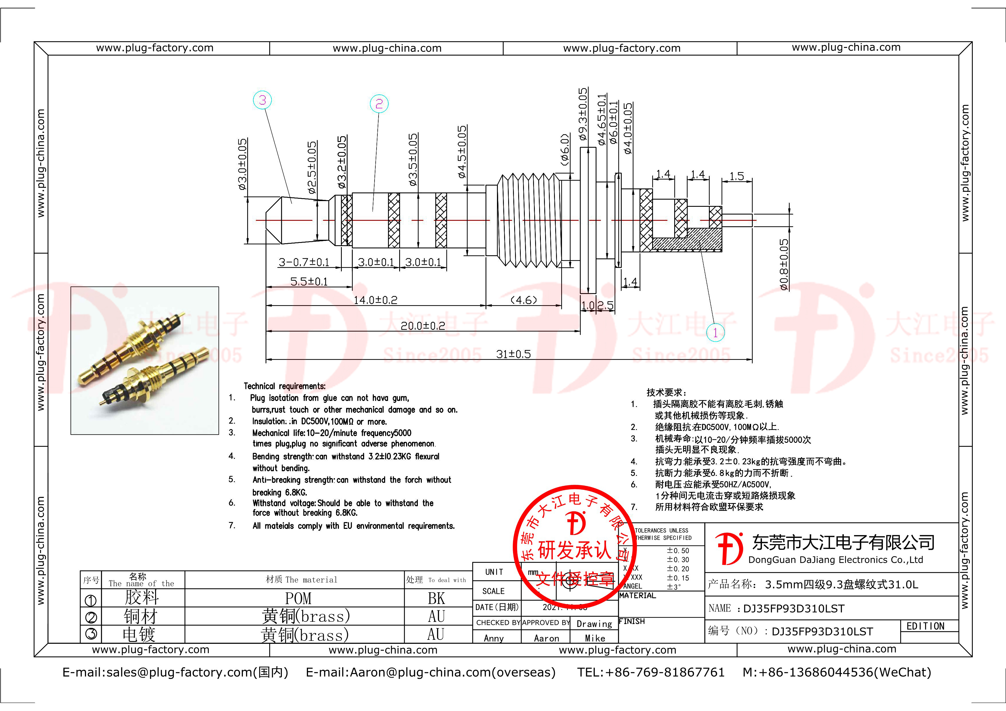 產(chǎn)品說明:耳機插頭 3.5mm四級9.3盤螺紋式 31L