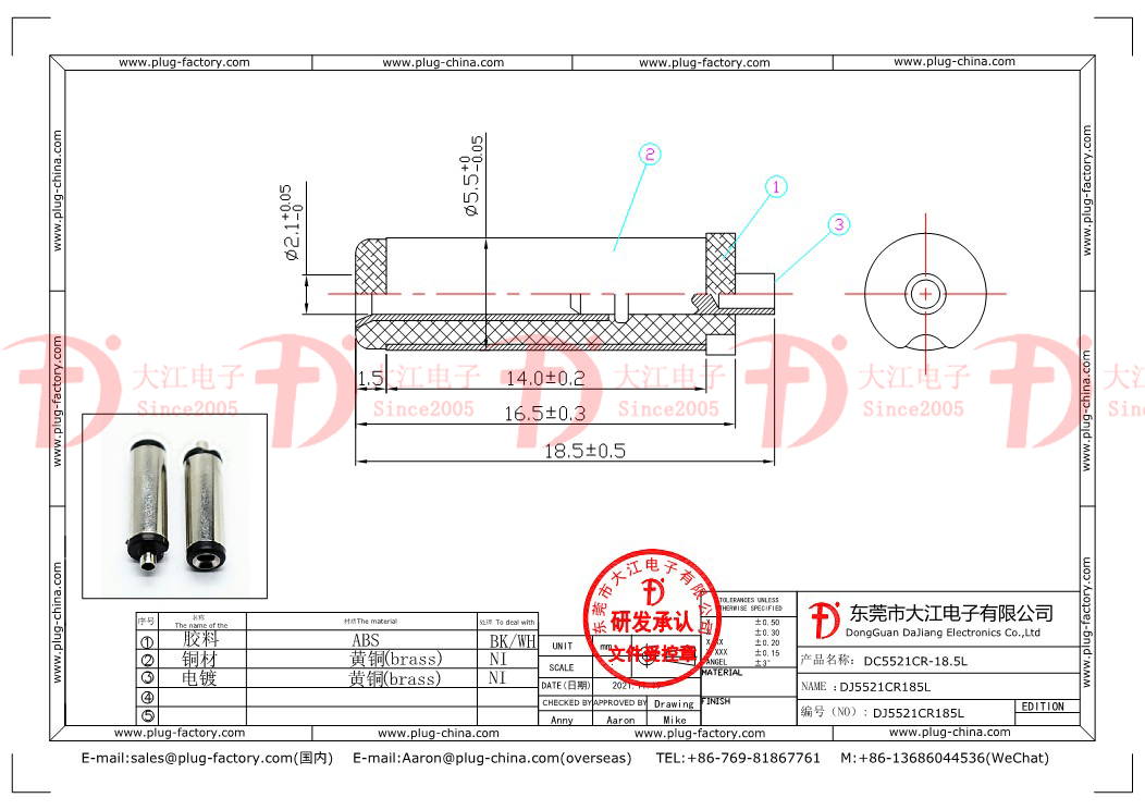 產(chǎn)品描述:OD=5.5mm,ID=2.1mm,L=18.5mm;黑膠及其它顏色,鍍層為鍍鎳.