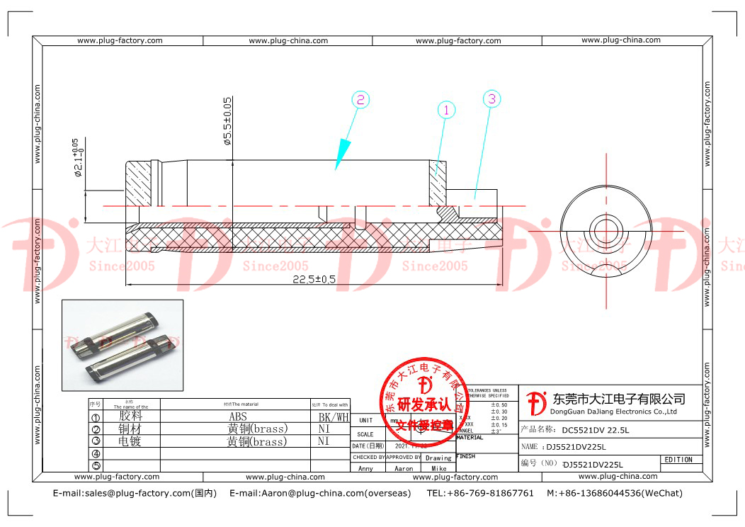 產品描述:OD=5.5mm,ID=2.1mm,L=22.5mm;黑膠及其它顏色,鍍層為鍍鎳.