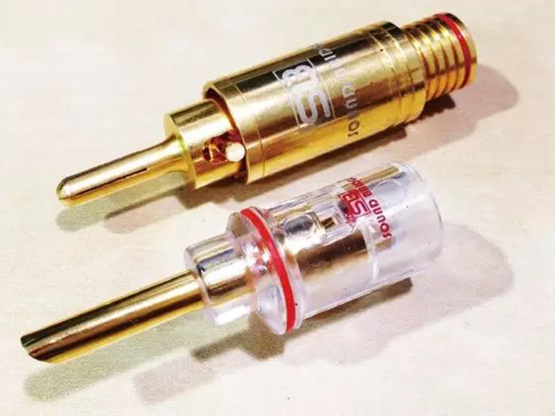 除了內建擴大機的主動式喇叭之外,所有的喇叭都必須依靠喇叭插頭來與擴大機做連接。常見的喇叭插頭有三種:香蕉、波浪、Y 型插,這三種插頭都擁有相同的特性以及傳輸功能,僅形狀、固定方式與聲音表現等三個特性有差異。喇叭插頭與前面提到的那些多接點插頭不同,一個喇叭插頭只能導通「一個極性(正負極其中之一)」,因此一個聲道必須用上「兩個」 插頭才能完成傳遞,比 RCA 插頭更加麻煩。但喇叭插頭接觸面積大、且能容納更粗的線材,在傳遞訊號的能量上會比前面的幾種插頭都還要大,因此對于必須強調訊號能量的喇叭線材來說就特別合適。上圖整顆金色的插頭就是所謂的「香蕉插」,英文名稱就叫做 Banana Plug,非常有趣。這種插頭利用中段的旋轉金屬蓋往前破僅撐開有彈性的弧形金屬頭,讓金屬插頭能緊緊的固定在喇叭座中,讓喇叭線不會松脫;下面的塑料插頭則是所謂的「波浪插」,這種插頭是利用硬度較高的銅片沖壓而成,在銅片被壓成圓形的切口處切出「波浪形狀」,讓插頭能維持向外撐的彈力,讓插頭能自己撐在插座之中并確保插頭不會松脫。