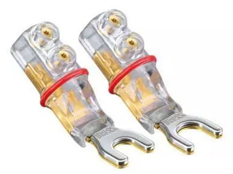 另一種不是「插進」喇叭端子座的插頭就叫做「Y 型插」,這種插頭必須先將喇叭座上的旋鈕擰開,再把上面這種插頭的缺口從擰開的地方塞進喇叭端子座中,再將旋鈕擰回去夾緊喇叭插頭,讓插頭不會松脫掉落。不過有部分玩家認為,Y 型插的接觸面積較小、且與喇叭端子的連接處呈直角接觸(香蕉與波浪插直接插入喇叭座,因此是直線接觸),因此在聲音動態、高低頻延伸上遜于香蕉插與波浪插,不過音響這種東西基本上就是個人修行各自體會,這里就不辯證到底誰優誰壞的問題,就單純把部分玩家的看法跟大家分享,請大家自行玩玩自行體會啰!