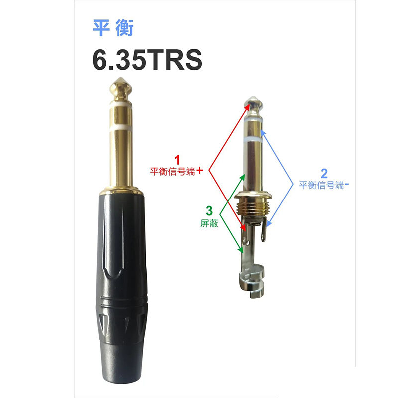 6.35TRS(大三芯)插頭的1為平衡信號+端(熱端)、2為平衡信號-端(冷端)、3為平衡信號屏蔽端。