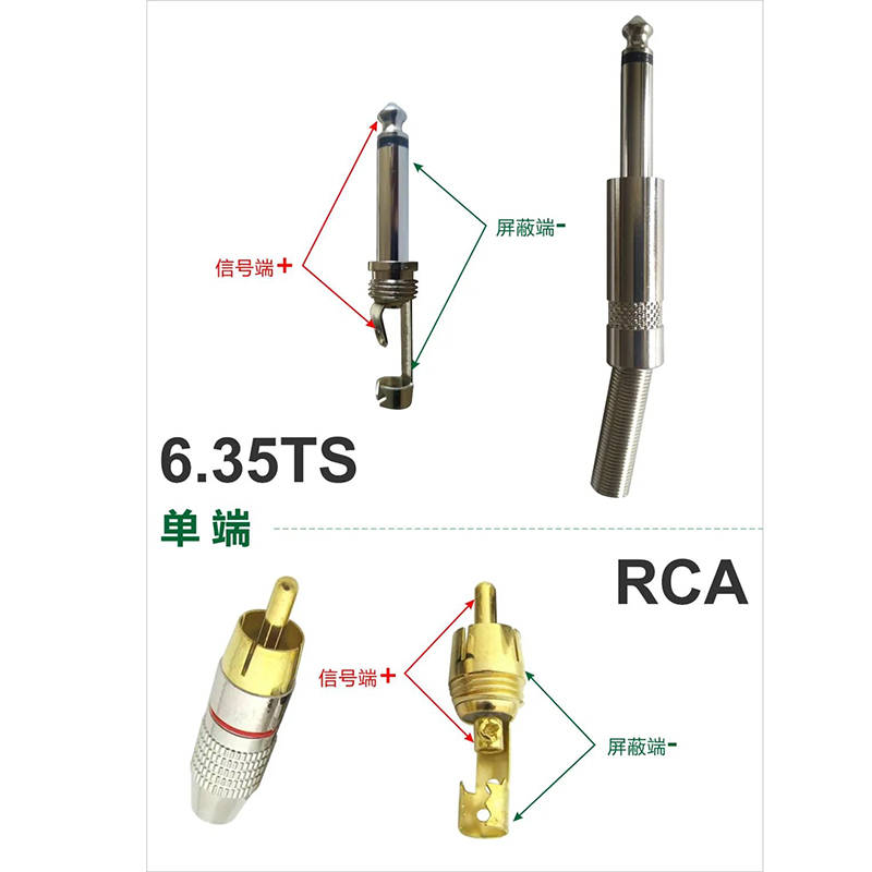6.35TS和RCA頭都是單端的結構(信號端+屏蔽端),6.35TS對RCA頭的線材常用于音源(DVD、卡座、VOD單機板等)與調音臺的連接、KTV工程中音頻設備之間的連接。通常音源設備的輸出、輸入接口均為RCA接口形式,調音臺的音源輸入接口為6.35TS形式。由于6.35TS和RCA頭都是單端結構,接線時只需將其中一條芯線焊接在插頭信號端(插頭中心)、焊接在插頭的屏蔽端即可。