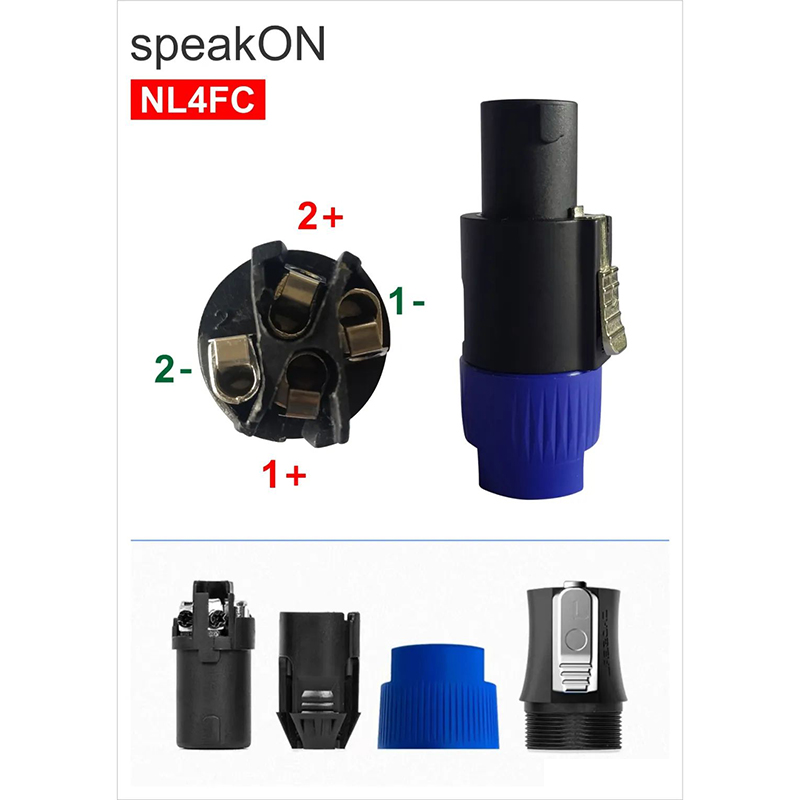 音箱線只需按照功放和音箱的標示來安裝插頭即可。常見的音箱線兩端為speakON的規律是1+對1+、1-對1-;功放的輸出端基本上都是1+和1-。