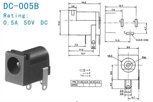 dc插座中心針有:0.5mm/0.7mm/1.3mm/1.65mm/2.0mm/2.5mm/3.0mm。常見的dc插座規格有:2.35*0.7TVdc插頭、3.0*0.1TV dc插頭、2.5*0.75TVdc插頭、3.5*1.1TVDC插頭、3.2*0.9TV dc插頭、3.5*1.35TV、2.0*0.6TVdc插頭5.5*2.1TVdc插頭、6.5*3.0TVdc插頭、5.5*2.5TVdc插頭。