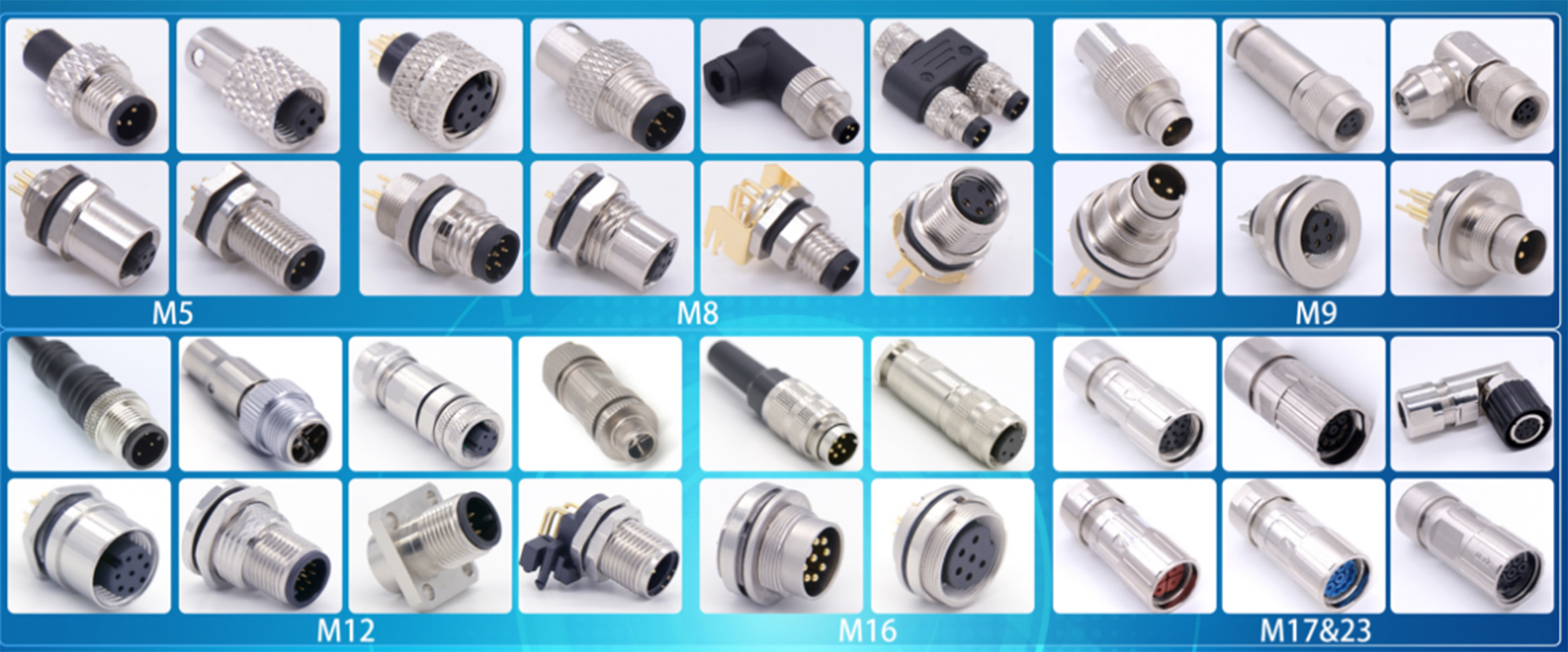 各類M5、M8、M9、M12、M16、M17、M23 連接器,推拉自鎖 B、K系列連接器,HR10、 HR25、SR30系列連接器,Y27、Y50、YL、TL 連接器,各類航空連接器(航空插頭)及其相應的線纜組裝件。支持 OEM/ODM,滿足客戶特殊需求。