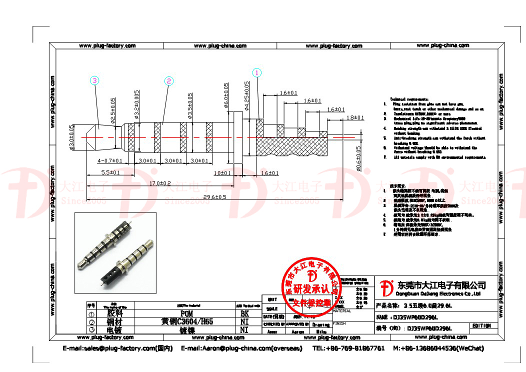 產品說明:耳機插頭-3.5五級6.0盤29.6L