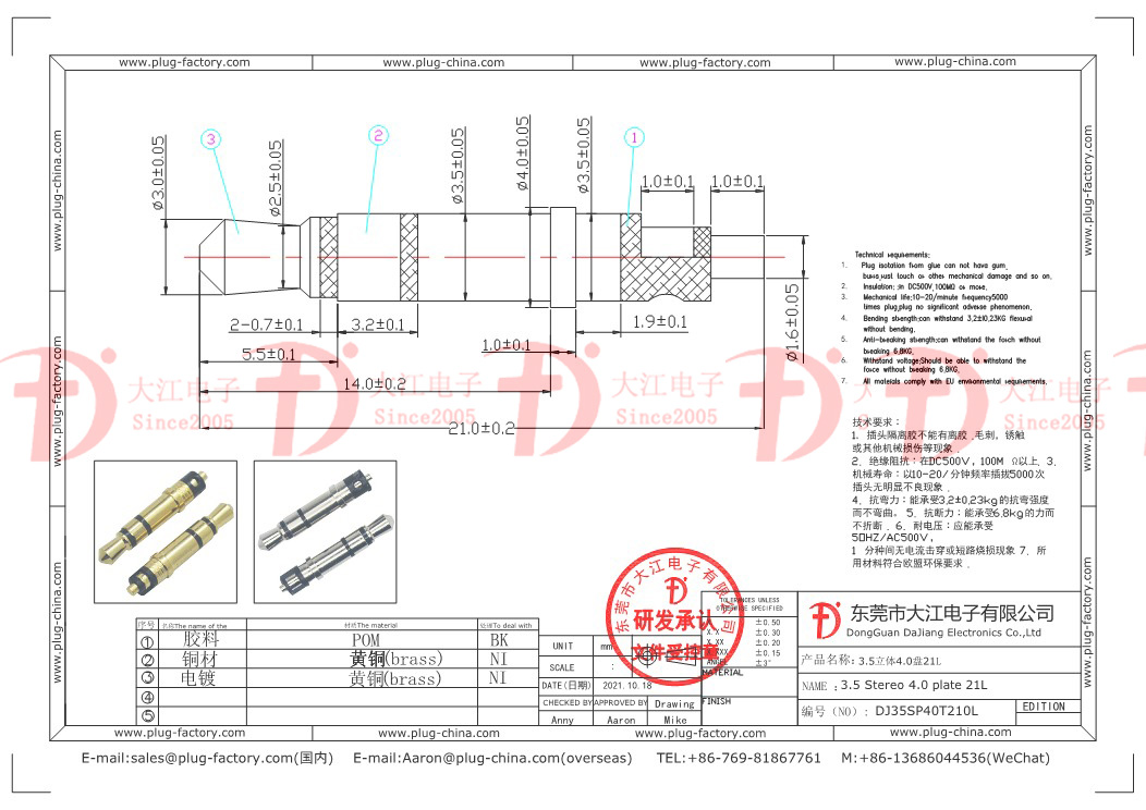 產(chǎn)品說明:耳機(jī)插頭-3.5mm立體4.0盤21.0L 鍍鎳