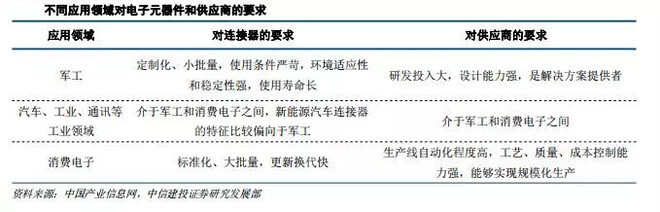 連接器應用廣泛,主要應用于汽車(23%)、通信(21%)、消費電子(15%)、工業(12%),四大應用領域市場份額超過7成,其后依次是軍事航空(6%),其它領域如醫療、儀器儀表、商業與辦公設備等共計占比16%。